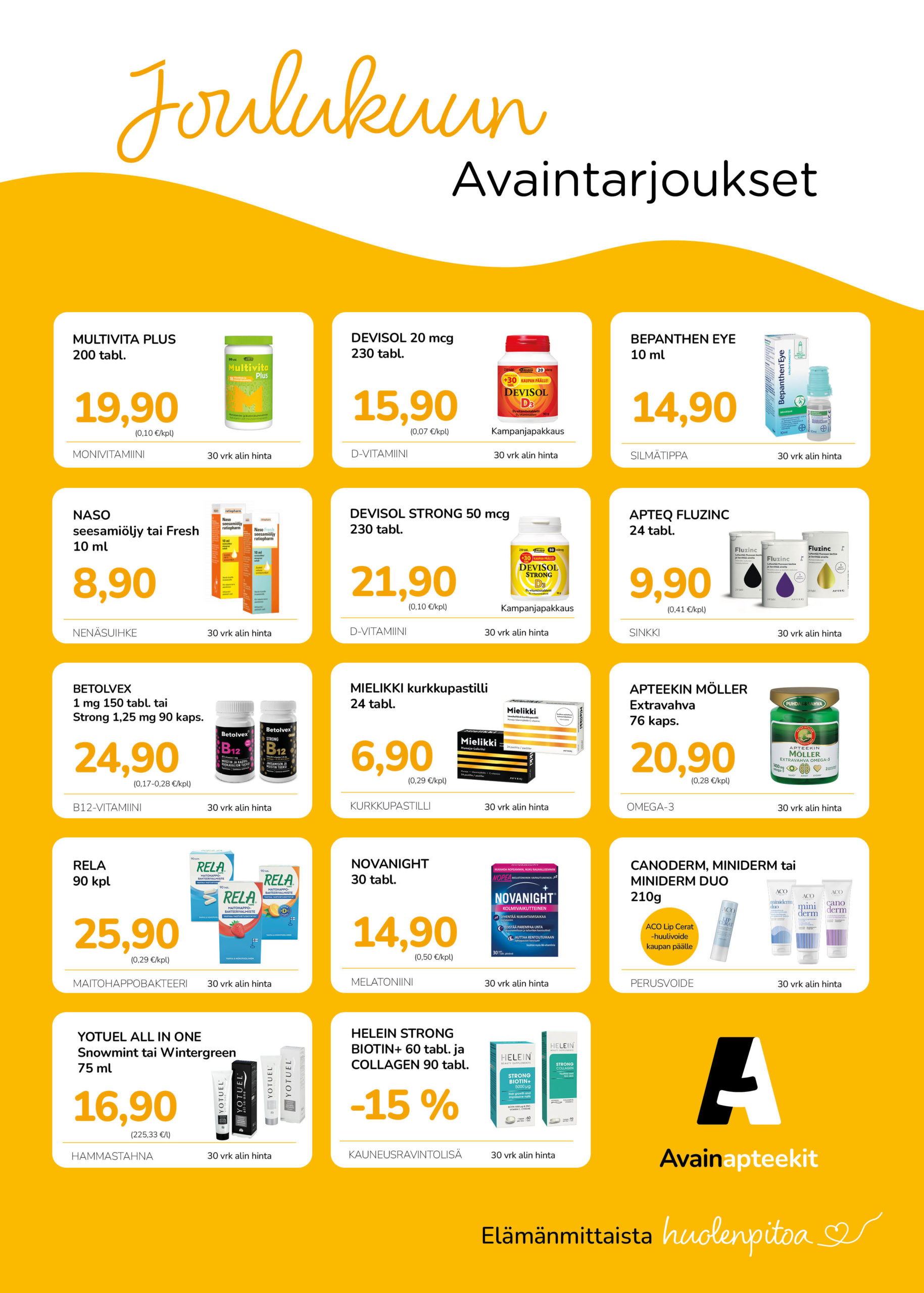 Olemme osa Avainapteekit-ketjua ja tarjoamme kuukausittain vaihtuvan ja monipuolisen valikoiman tarjoustuotteita hyvinvointiasi tukemaan.